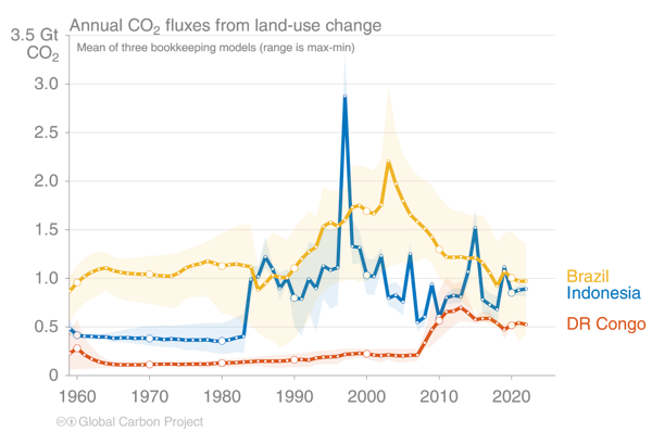 Tren penurunan terjadi karena berkurangnya deforestasi dan kenaikan tipis reforestasi. Penyumbang terbesarnya adalah Brasil, Indonesia, dan Republik Demokratik Kongo. Tiga negara ini menyumbang 55% dari emisi bersih CO2 global dari alih fungsi lahan.