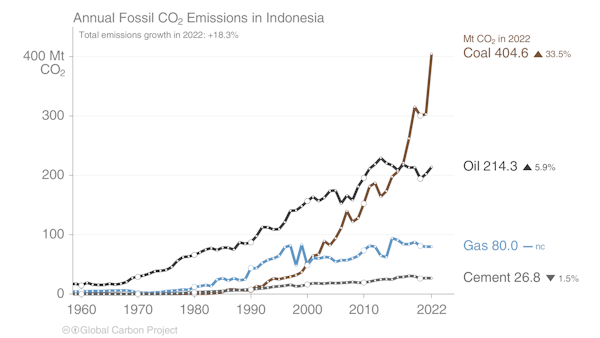 Di Indonesia, total emisi fosil CO2 melesat sebesar 18% pada 2022. Angka ini merupakan yang tertinggi selama 60 tahun terakhir. Cepatnya pertumbuhan sebagian terjadi karena usaha Indonesia memulihkan ekonomi pascapandemi. Sementara, sebagian lainnya adalah karena pertumbuhan pembangkit listrik tenaga uap (PLTU) baru sehingga emisi CO2 dari batu bara naik pesat sebesar 33%.